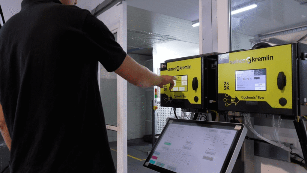 Właśnie tu kluczowe znaczenie zyskuje Cyclomix Evo, system automatycznego mieszania 2K od Sames. Urządzenie umożliwia dynamiczne, dokładne dozowanie składników farby natryskowej i jej aplikację w sposób powtarzalny, z możliwością pełnej konfiguracji parametrów – również zdalnie.